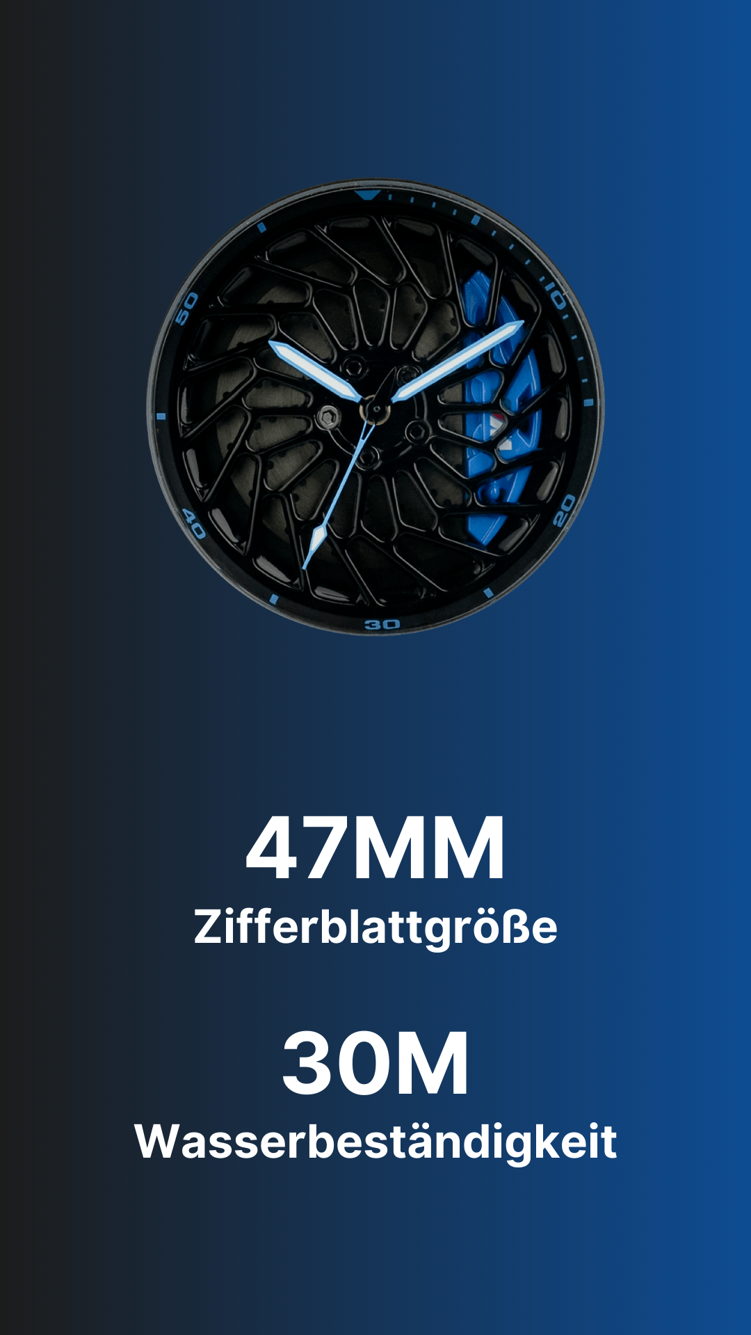 Wenn Sie Ihr Handgelenk bewegen, dreht sich ein Reifen im Inneren der Uhr und imitiert so die Bewegung eines Autos.